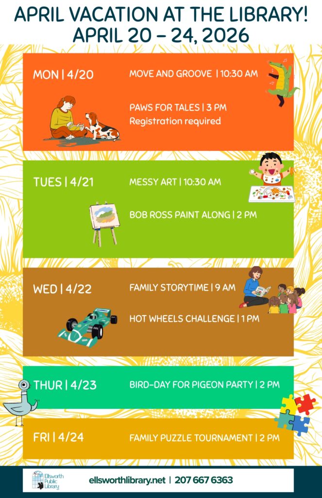 Some programs may require registration. We encourage you to check our calendar regularly. For more information, contact us via email at info [at] ellsworthlibrary.net or call us at 207.667.6363.